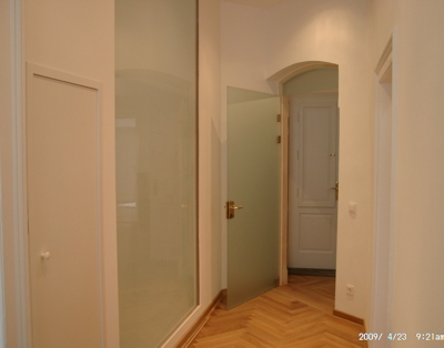Vollglastür in massiven Stock, oben mit feststehenden Segmentteil.