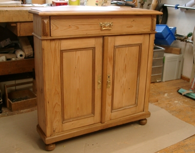 Eckschrank, war vorher dunkel rotbraun gebeizt und lackiert, wurde abgeschliffen und mit Wachsbeize gebeizt.